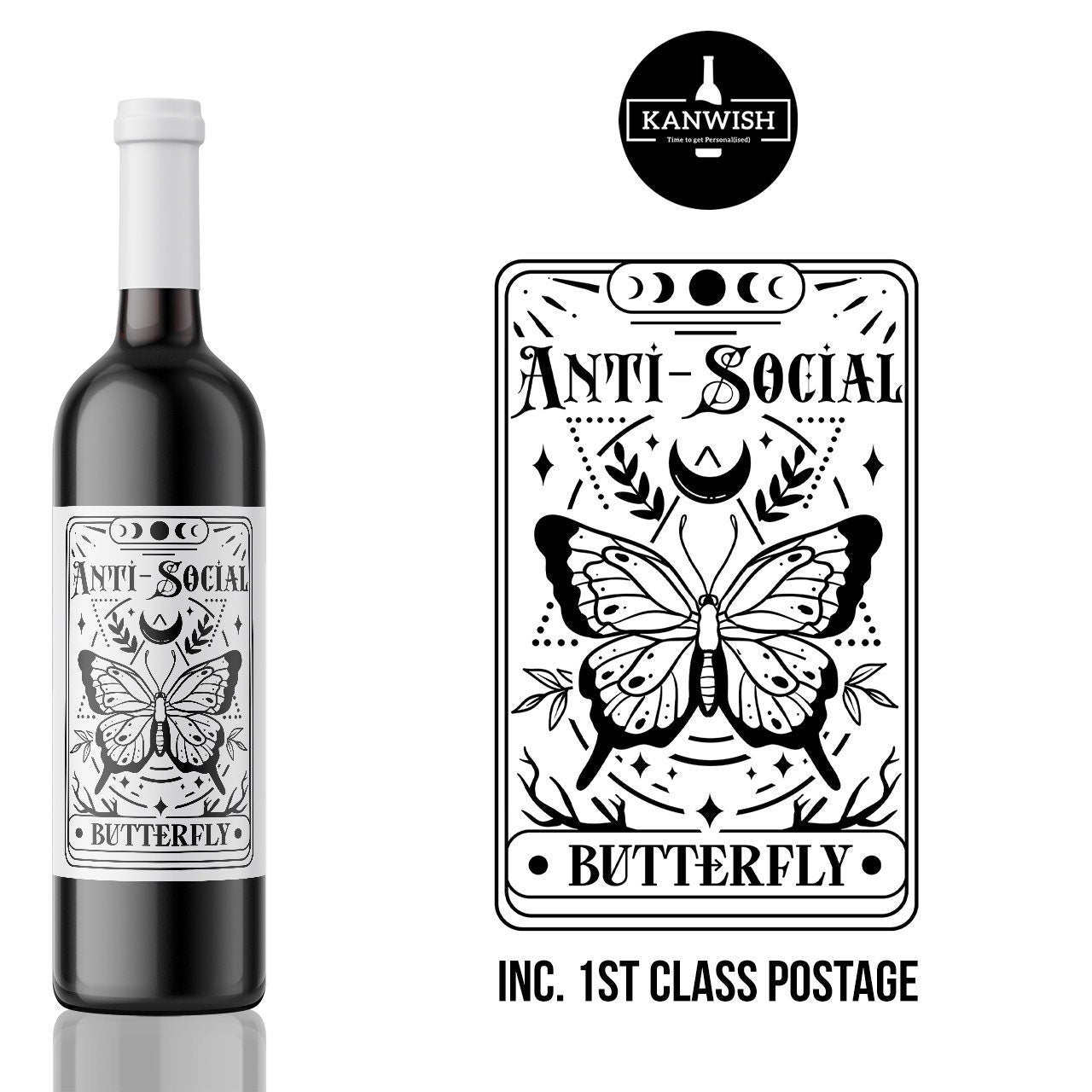 Anti Social butterfly Wine Label, funny banter custom wine label, personlised wine label sticker, Birthday wine label