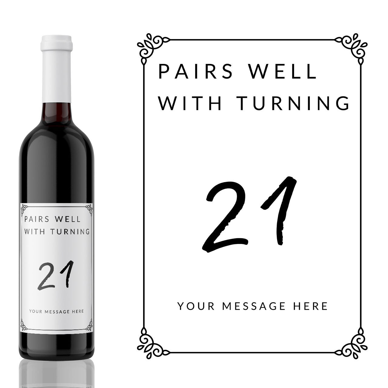 Pairs well with Turning 21 wine label, Birthday Wine Label, Birthday wine Gift, 21st Birthday, 40th Birthday, 50th Birthday, custom wine