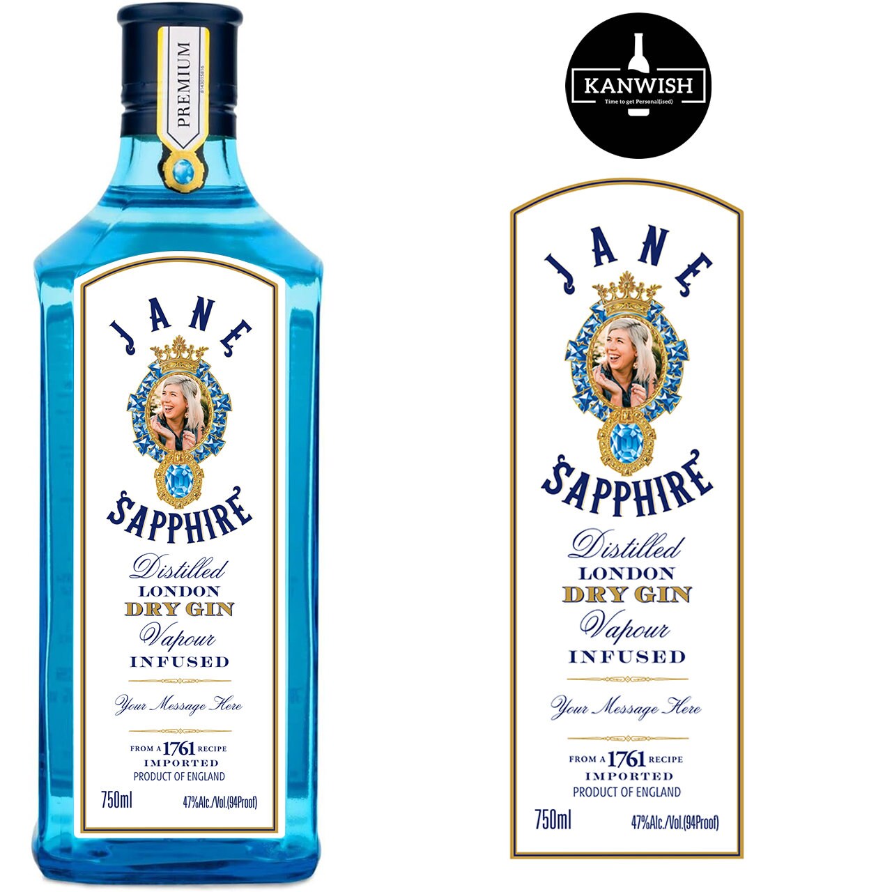 Personalised Bombay Sapphire photo gin bottle label birthday gift - and any text - perfect for any occasion